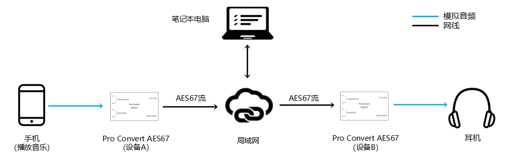 使用两台美乐威Pro Convert AES67设备(用A和B区分)搭建AES67音频流传输方案,具体设备连接如下图所示。
