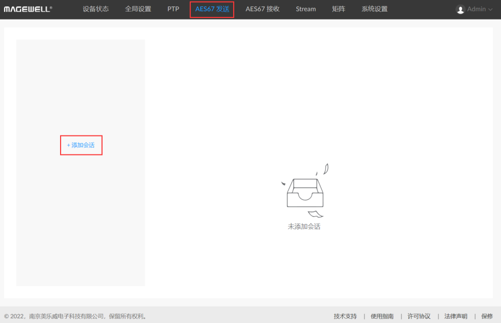 1. 登录设备A的Web UI,进入“AES67发送”页签。点击“添加会话”。
