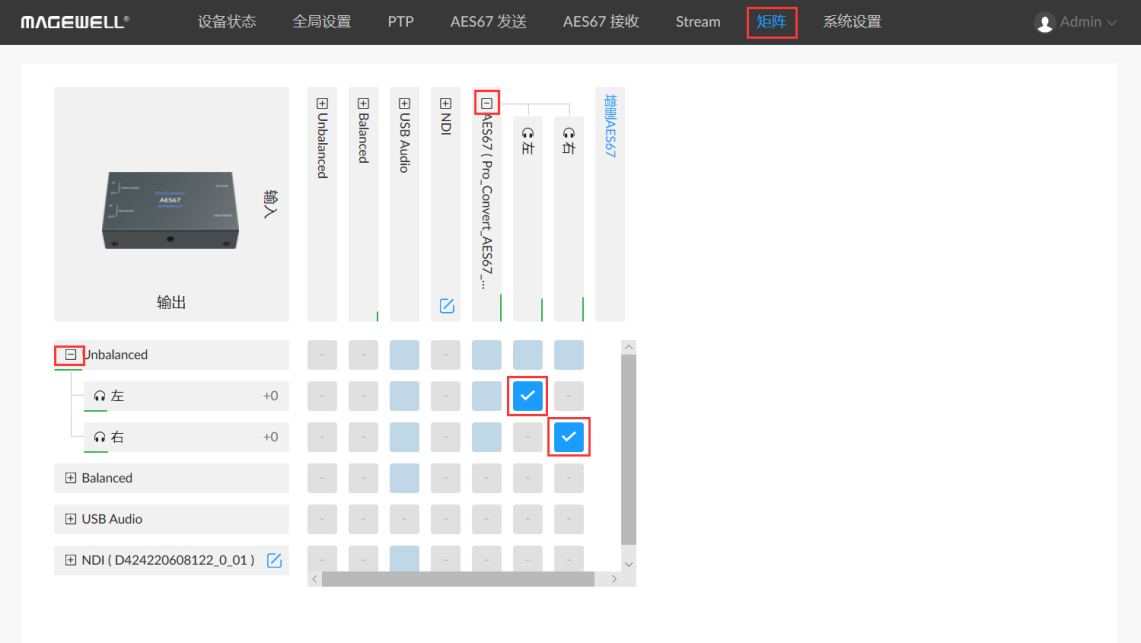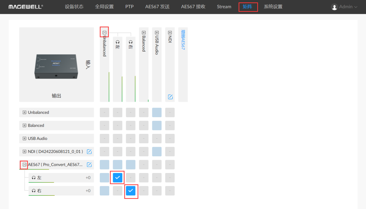 3. 进入“矩阵”页签,点击展开“输入-Unbalanced”和“输出-AES67”声道列表,将Unbalanced和AES67的左声道和右声道配对勾选。