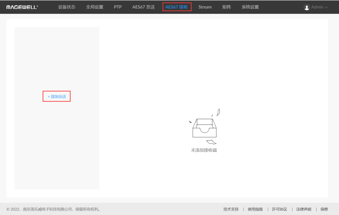 4. 再登录设备B的Web UI,进入“AES67接收”页签。点击“添加会话”。