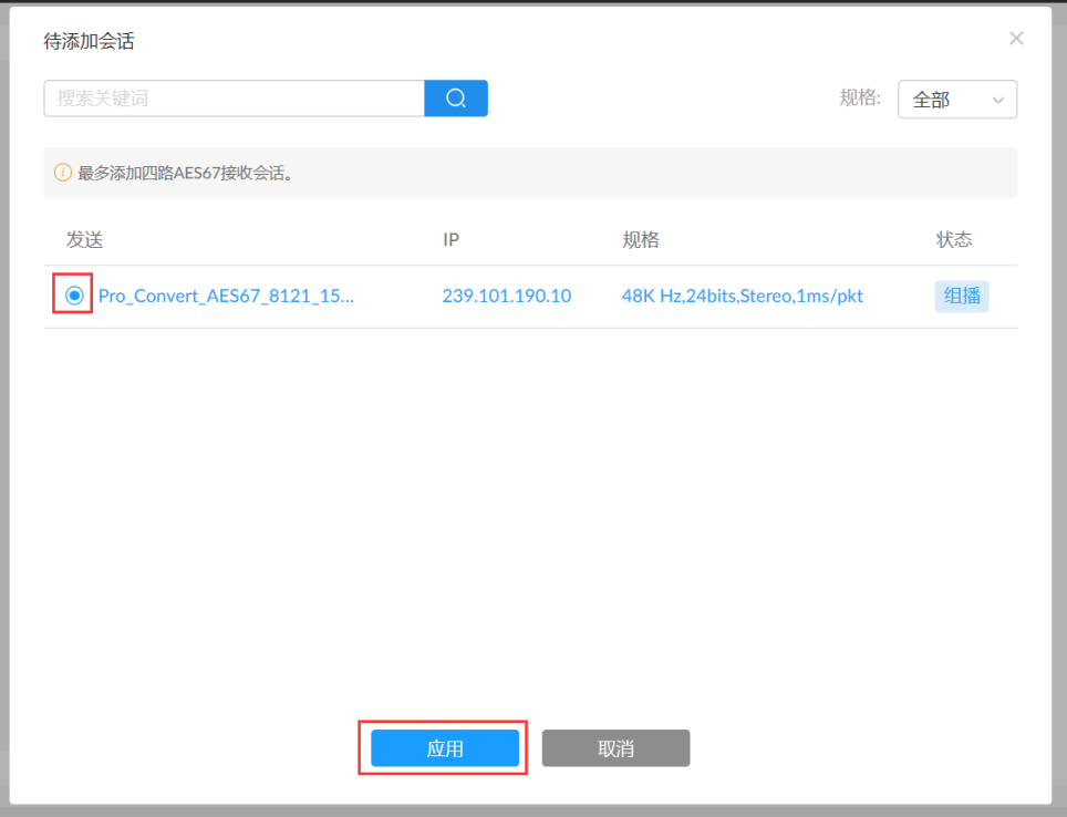 在弹出的页面中可以发现在局域网内的所有AES67音频流,勾选对应设备A发出的AES67音频流,点击“应用”。
