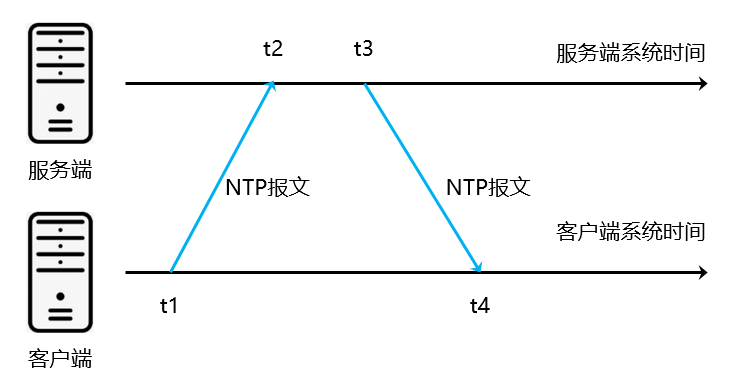 这样就可以得到NTP报文的往返时延为 (t4-t1) – (t3-t2),客户端和服务端之间的时间差为 ((t2-t1) + (t3-t4)) / 2。客户端即可基于以上两个参数来调整自己时间,使之与服务端时间同步。