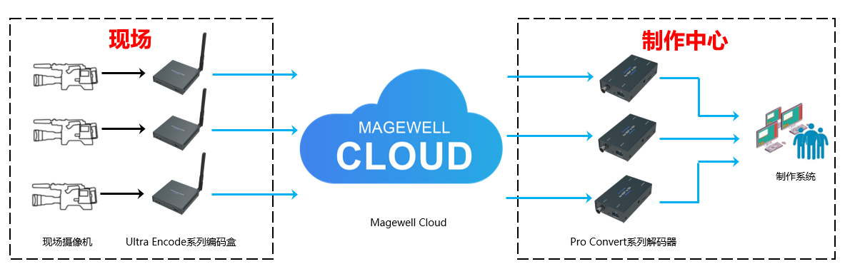 下图展示了美乐威基于SRT的跨互联网远程制作方案示例。在这个工作流程中,来自不同地点的多台摄像机每个都连接到美乐威Ultra Encode系列编码盒,编码成为SRT流传输到Magewell Cloud,Magewell Cloud再将这些SRT流分别转发给制作中心的美乐威Pro Convert系列解码器,然后制作团队可以制作内容并进行分发。