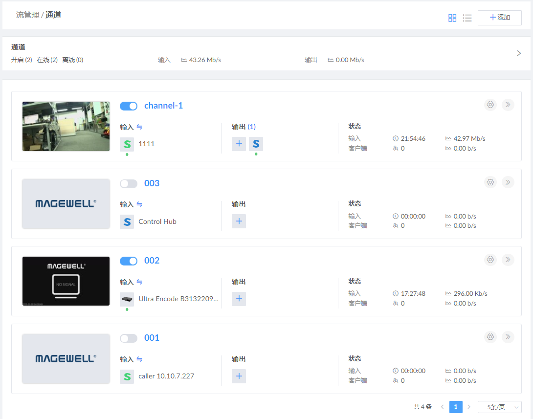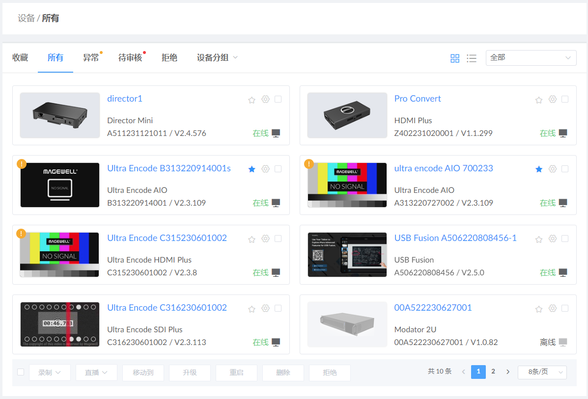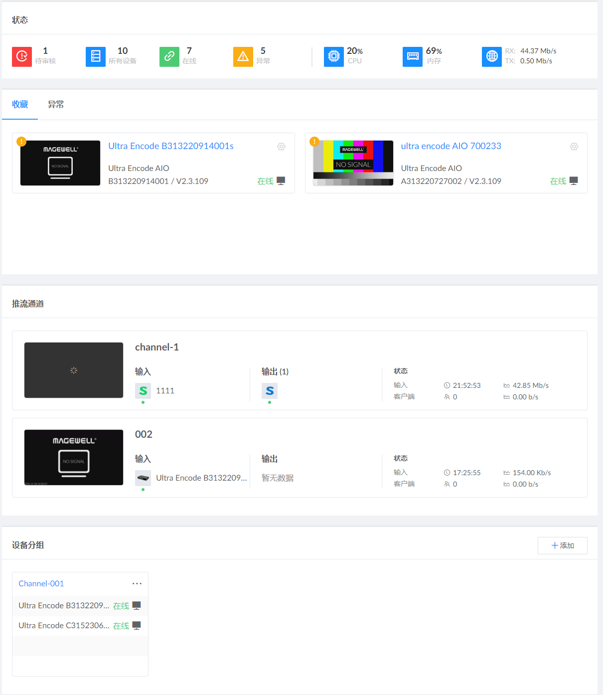 在美乐威Control Hub上实时查看设备和输入/输出视频流的状态并进行配置、管理。Control Hub支持的设备类型见支持的设备。