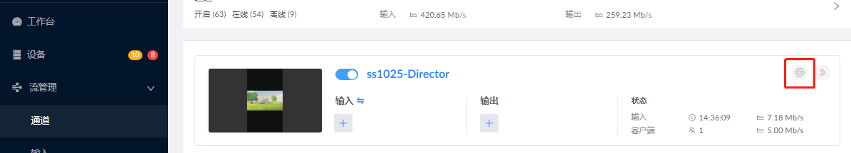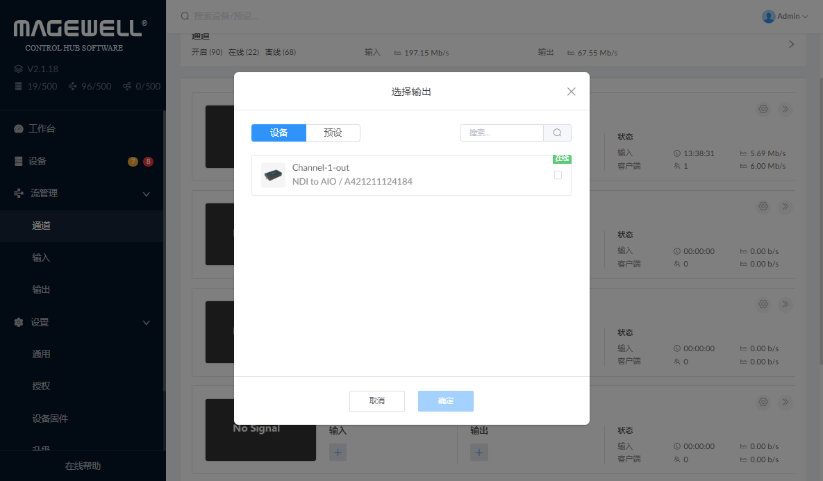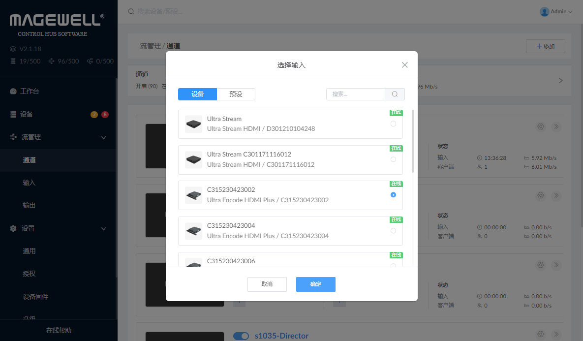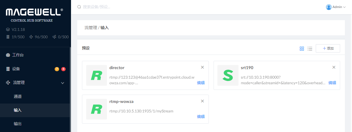 1. 在“流管理 > 输入”页签,管理输入预设。2. 在“流管理 > 通道”页签,添加预设。
