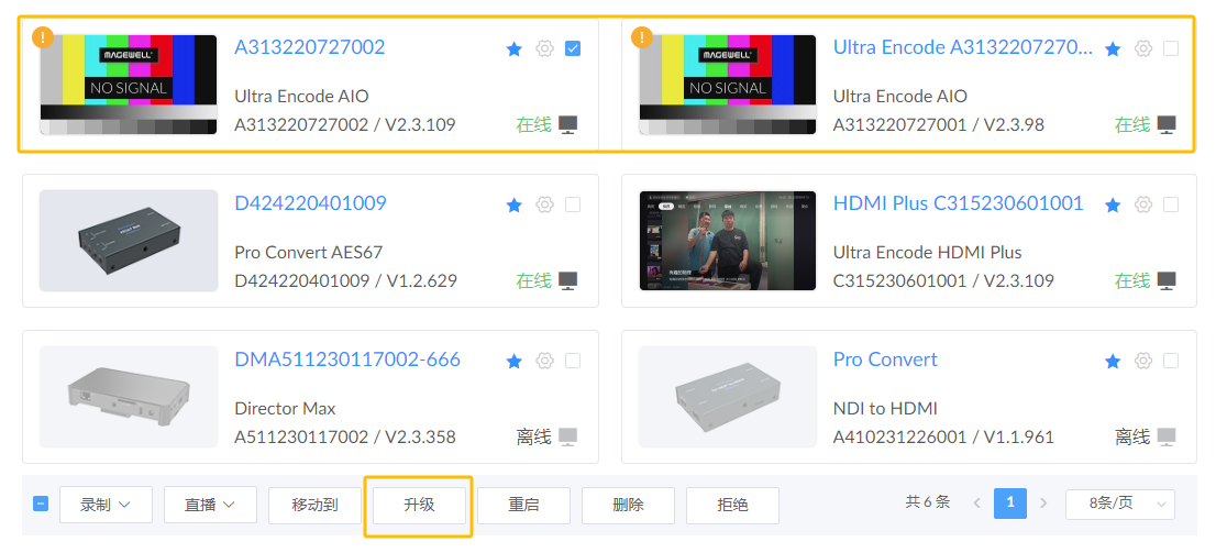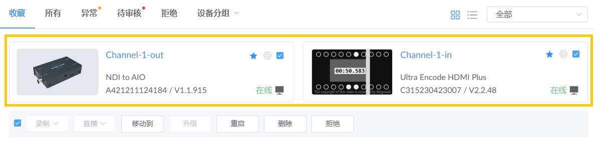 - 选择一个或多个Ultra Stream、Ultra Encode AIO、Ultra Encode Plus系列的 设备,一键启动/停止录制、直播。