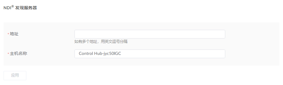 Control Hub内置发现服务,可作为发现服务器使用,也可根据实际环境配置使用其他NDI®发现服务服务器。如有多个地址,用英文逗号分隔。