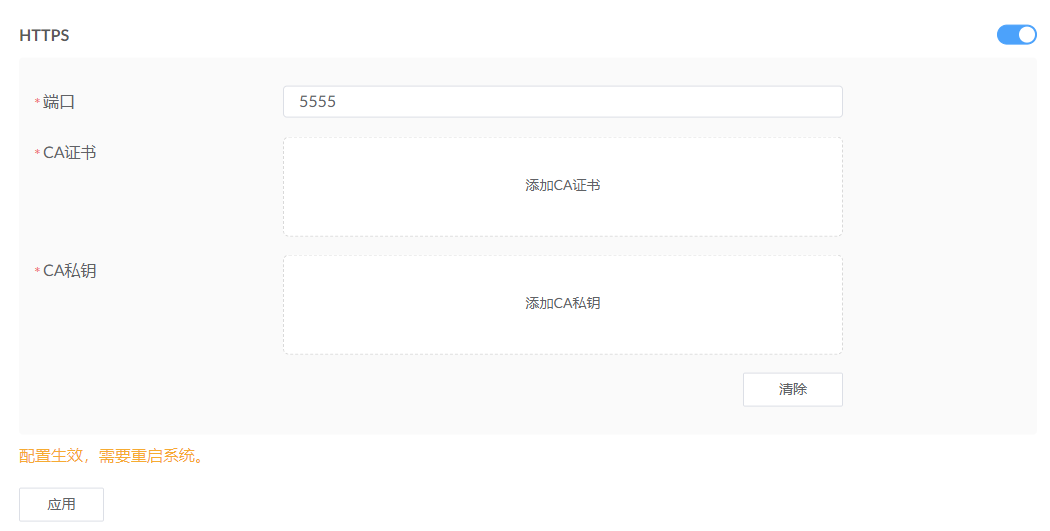 清除后,HTTPS将恢复默认状态,即关闭HTTPS,清除证书和私钥,端口恢复为默认。