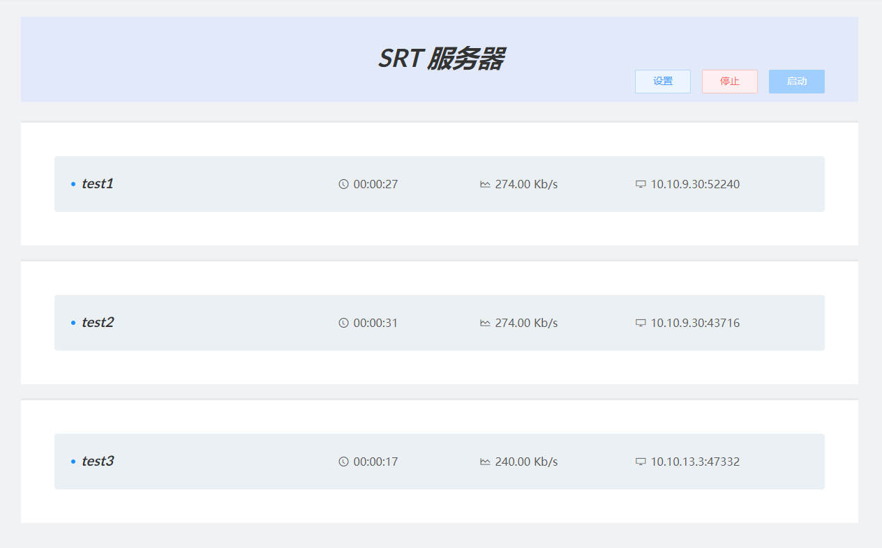 - 点击“停止”,关闭SRT服务,此时所有SRT连接都将中断。