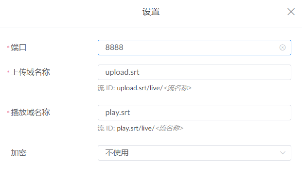 “上传域名”:必须与SRT推流端指定的流ID中的域名字段一致,默认为upload.srt。