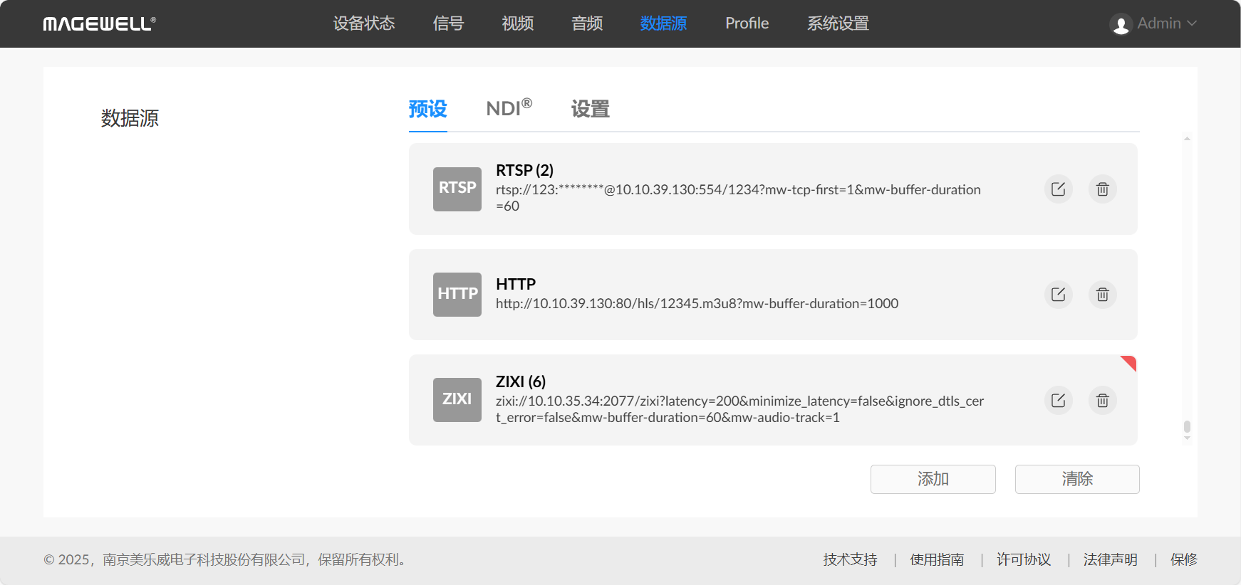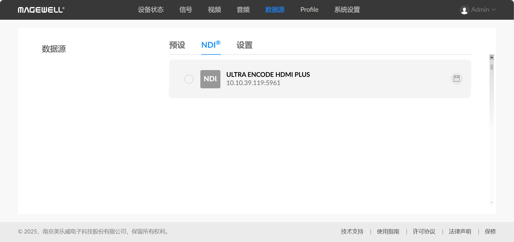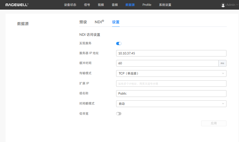 配置成功后,设备自动发现的NDI源显示在“数据源 > NDI®”页签中。不需手动添加。