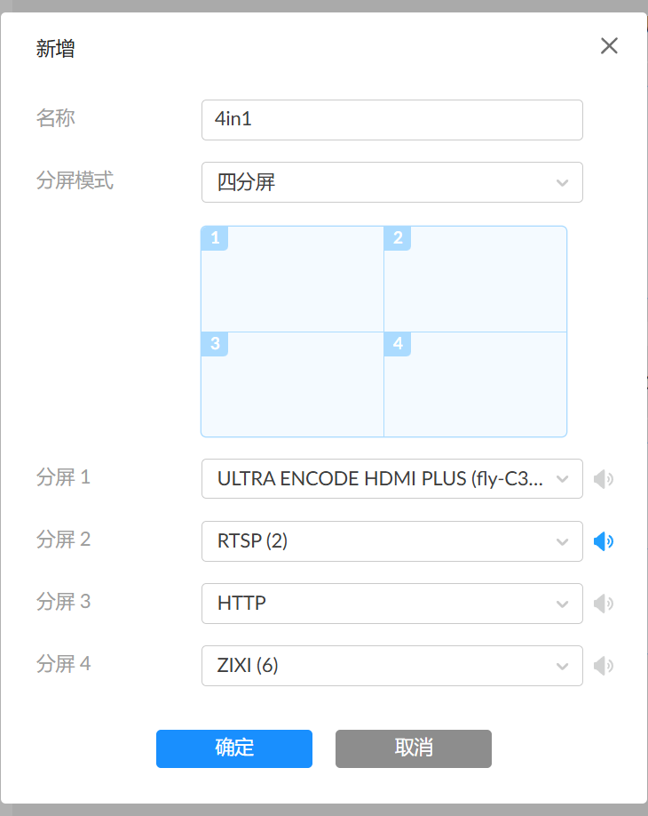 指定分屏1~4的数据源,并点亮分屏 2 行尾的喇叭,表示输出分屏 2 的声音。