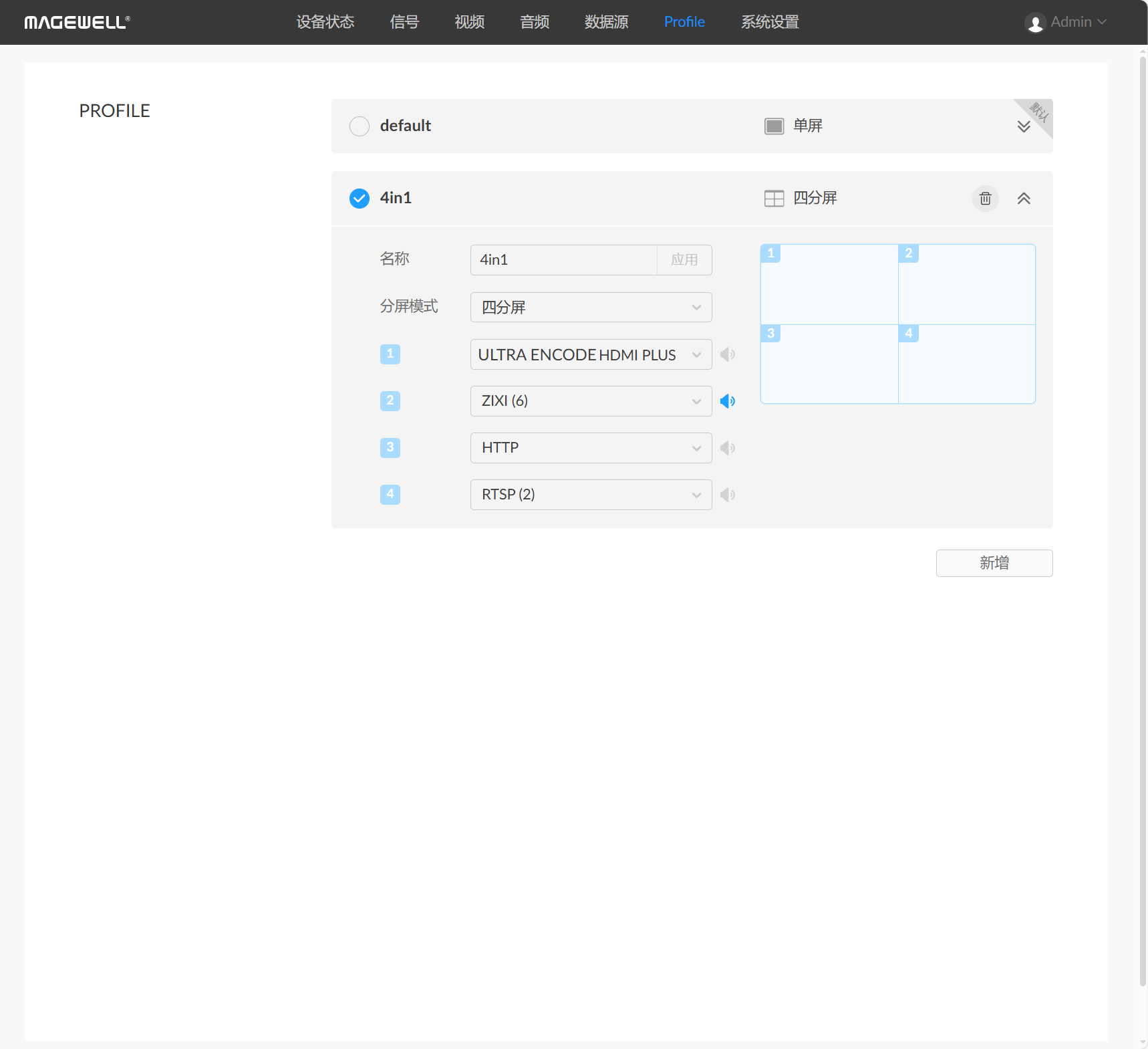 在“Profile”页签中,点击“新增“,添加四分屏输出模式。