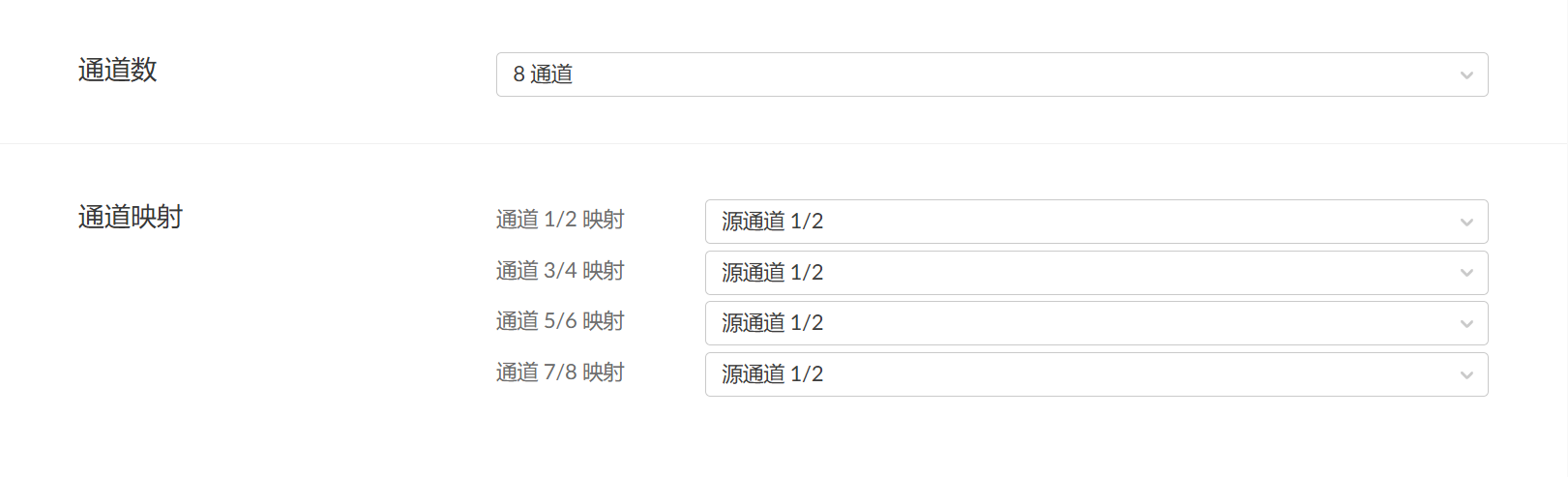 根据使用场景,选择音频通道。可设置“与输入一致”,也可设置为:“2 通道”、“4 通道”、“8 通道”。指定通道数后,设置输入和输出通道之间的映射关系。