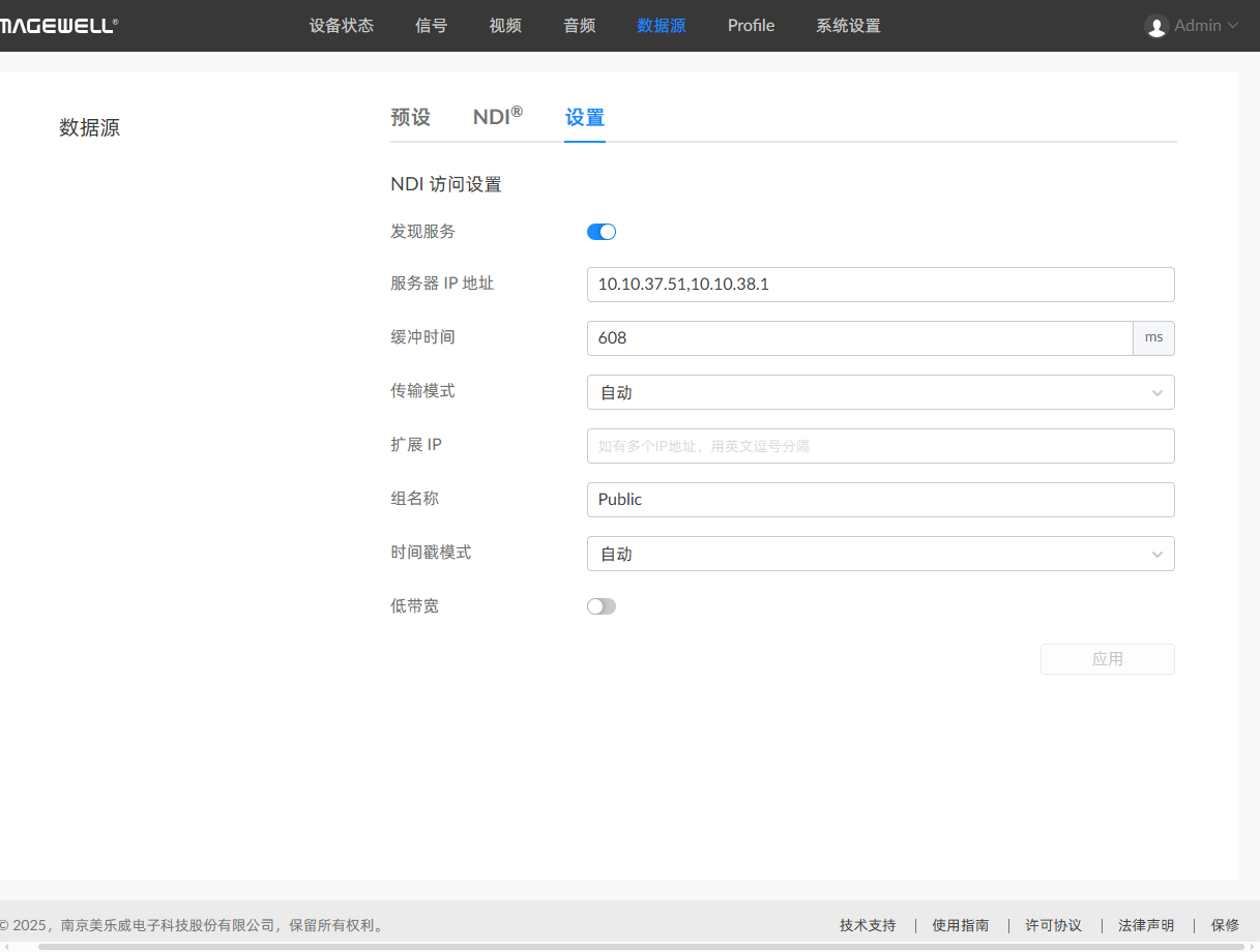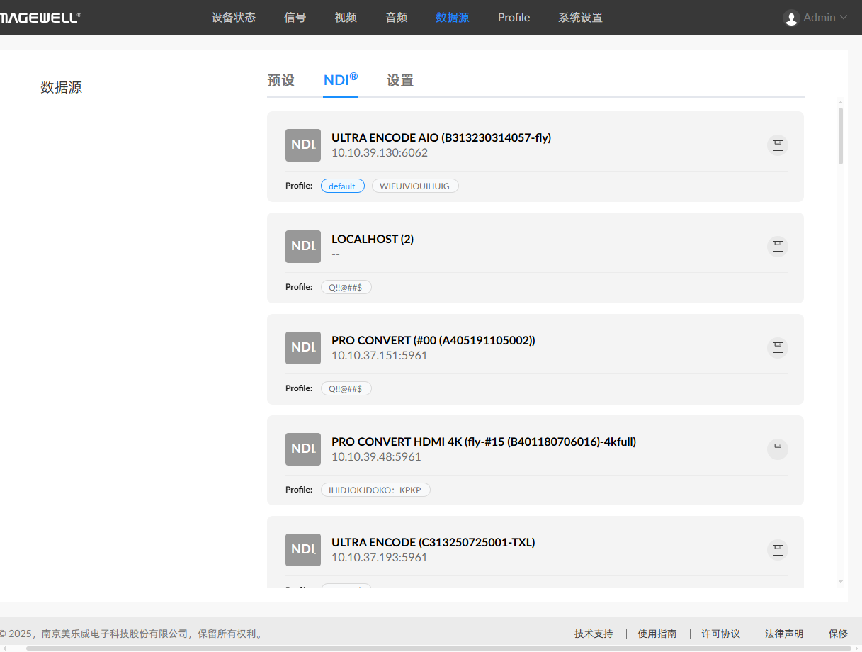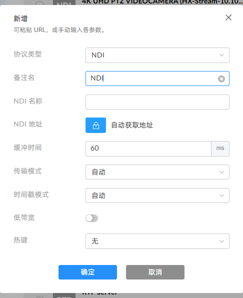配置后再手动添加的 NDI 源默认使用相同参数,也可单独修改各参数。