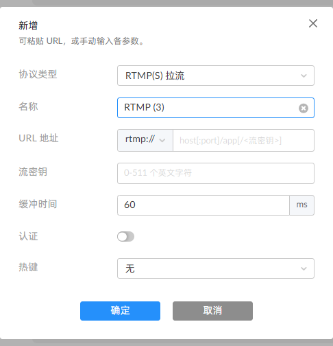 - “URL 地址” 输入 RTMP 推流端地址。如需解码直播平台的视频流,可从平台获取该视频的 RTMP 地址。