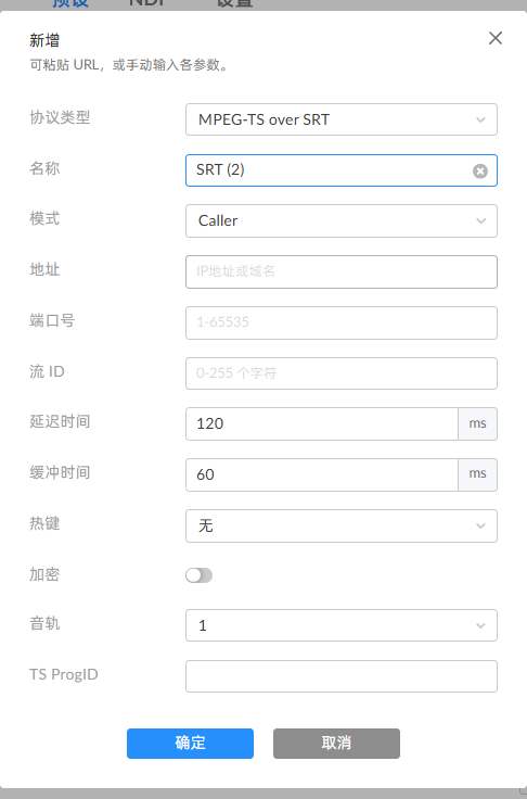 支持直接粘贴URL,设备可自动解析添加数据源。也可手动指定各个参数。