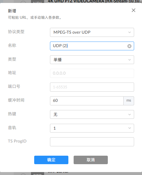 - “TS ProgID”: Program ID (Program Number) 是一个标识符,表示 MPEG 传输流中的一个逻辑服务,取值范围 1-10000000,默认为空。